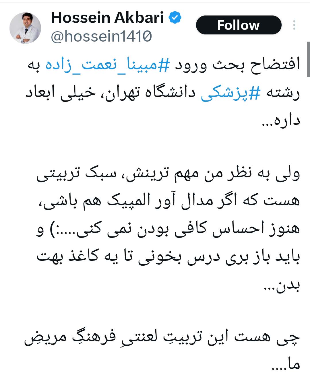 مبینا نعمتزاده تاکید کرده که پس از کسب مدال برنز المپیک پاریس و ارائه درخواست حمایت، منظورش از سهمیه دانشگاه، رشته پزشکی بوده است و نه رشته تربیت بدنی.